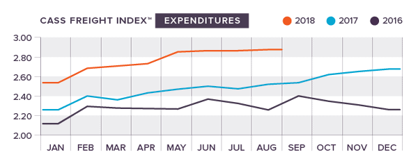 The Cass Freight Shipments and Expenditures Indices in Q3 continued to demonstrate, from both a pricing and volume perspective, that the U.S. freight economy is very strong. Shipments have decreased since they reached 1.307 in May, their highest number of the year – they sat at 1.227 in August – and expenditures have continued their 23-month increase, rising to 2.917, a 16.7% increase over last year.